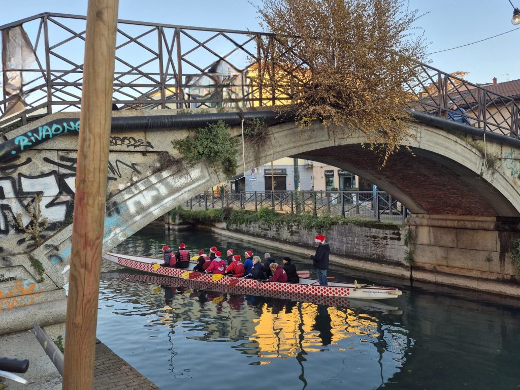 Essendo dicembre, noi abbiamo avuto anche la fortuna di veder passare nel Naviglio, un gruppo di canottieri-babbi Natale davvero caratteristici.